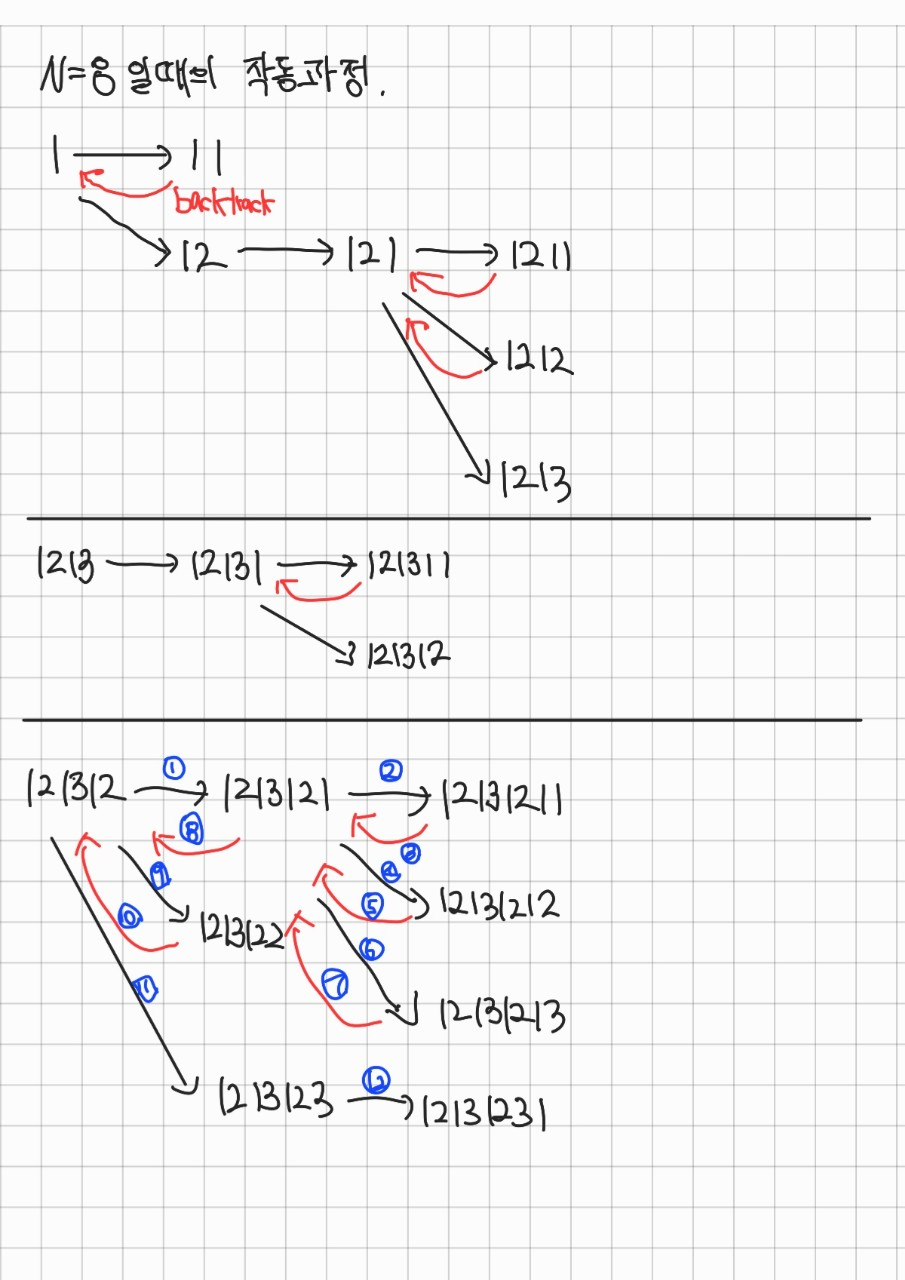 기본적으로 시작점(1213121)은 좋은 수열이기 때문에 backtrack을 거치지 않는다.