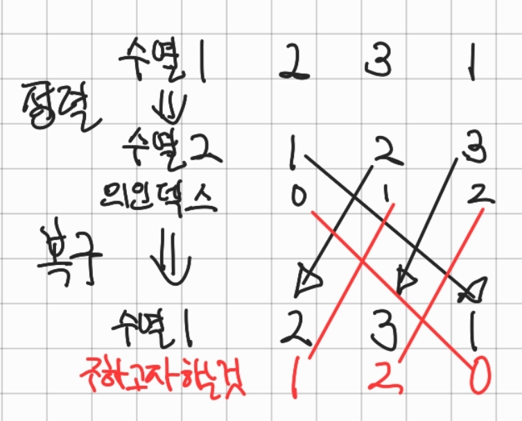 우리가 구하고자 하는 건 수열 2의 원소별 인덱스를, 수열 1과 같이 정렬되지 않은 상태로 만들고 싶은 것이다.