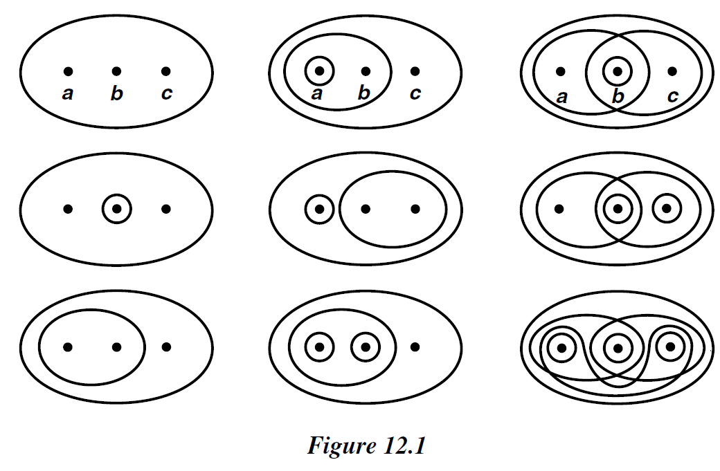 2. Consider the nine topologies on the set $X = \{ a, b, c \}$ indicated in Example 1 of $\S$12. Compare them; that is, for each pair of topologies, determine whether they are comparable, and if so, which is the finer.