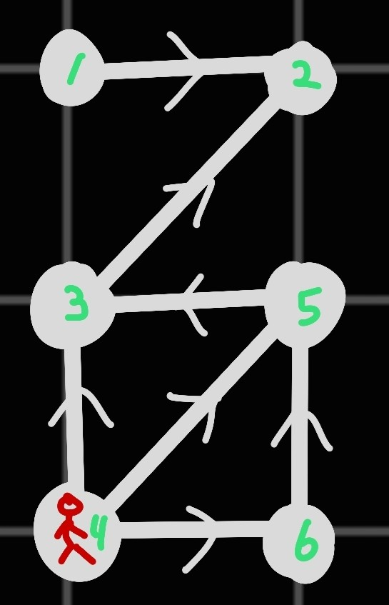 마지막으로, $4$번 노드에 말이 있다면, $3$번 노드, $5$번 노드, $6$번 노드로 말을 옮길 수 있다.