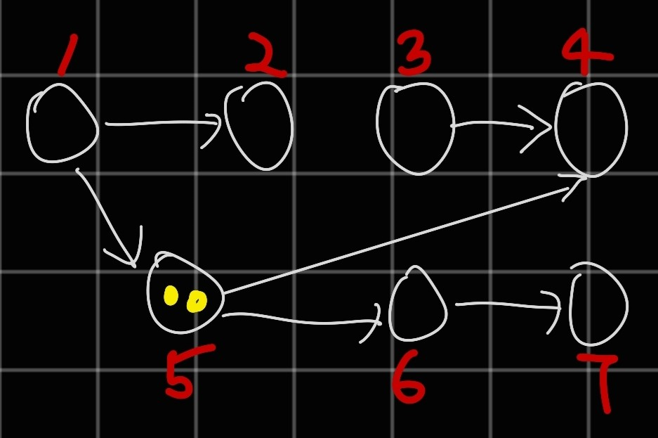 이런 경우, $5$번 노드에 놓인 두 개의 말은 같이 움직이므로 하나의 말로 생각할 수 있다.