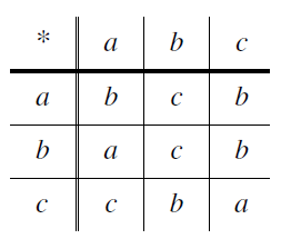 (왼쪽의 열에 쓰여있는 원소) $\ast$ (위의 행에 쓰여있는 원소)의 결과를 적은 것으로, 예를 들어, $a \ast b = c$임을, $b \ast a = a$임을 쉽게 알 수 있습니다.