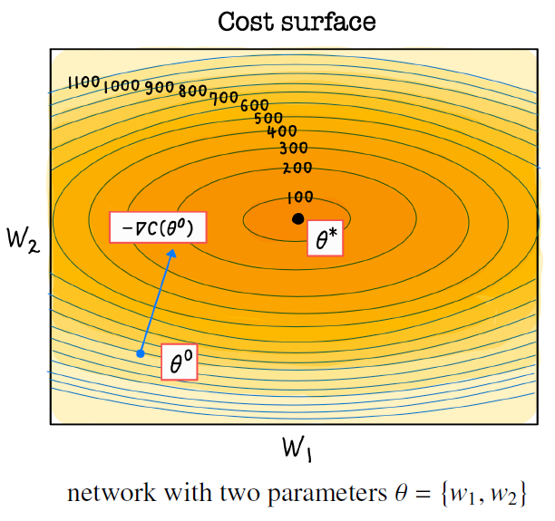 학습의 목표는 $\theta ^0$에서 최솟값인 지점인 $\theta ^{*}$로 가는 것입니다.