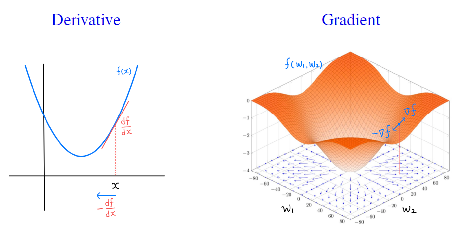 마찬가지로, 다차원 공간에서는 Gradient를 사용하는데, 이 Gradient의 "반대" 방향으로 가야 Minimum을 향한다는 것을 직관적으로 알 수 있을 것입니다.