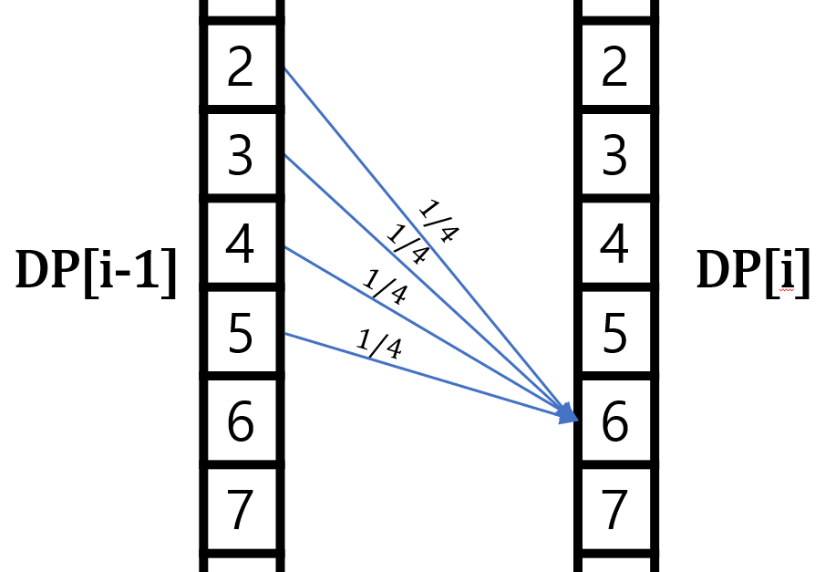 $$DP[i][j] = i번째 \ 주사위를 \ 던지고 \ 난 \ 후 \ 지금까지 \ 나온 \ 숫자의 \ 총 \ 합이 \ j일 \ 확률$$