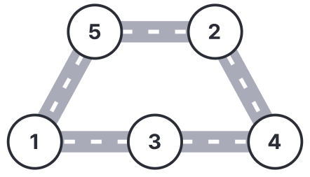 플레이어는 차를 타고 $S$번 도시에서 $E$번 도시로 이동하려고 한다. 플레이어가 두 도시 사이를 이동할 때는 항상 가장 작은 수의 도시를 거치는 경로를 따라 이동한다. 예를 들어 아래 그림과 같이 도시와 도로가 주어지고, 플레이어가 1번 도시에서 4번 도시로 이동하려고 할 때는 항상 1 → 3 → 4의 경로를 따라 이동한다. 이 경우에는 출발 도시와 도착 도시를 포함해 총 세 개의 도시를 거쳐 이동할 수 있다. 1 → 5 → 2 → 4의 경로로 이동하는 것은 출발 도시와 도착 도시를 포함해 네 개의 도시를 거치는 경로이므로, 플레이어는 해당 경로로는 이동하지 않을 것이다.