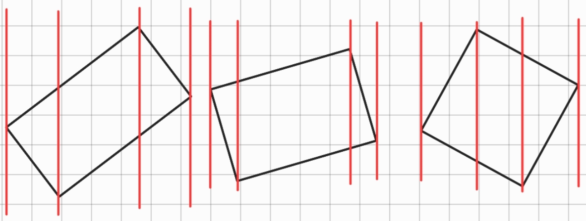 저렇게 그려보니 왼쪽부터 순서대로 1, 2, 3, 4번 평행선이라고 하면, 1번과 2번 평행선 사이 거리와 3번과 4번 평행선 사이 거리가 같아야만 직사각형을 그릴 수 있다는 것을 알 수 있다.