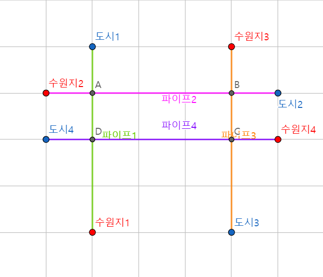 이 경우, 수원지에서 파이프가 만나는 것은 교차점으로 간주를 하지 않는다고 했으므로, 교차점은 두 곳이 만들어진다.