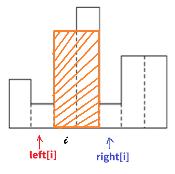 $i$번째 막대의 오른쪽에 있으면서 $i$번째 막대보다 처음으로 작게 되는 위치를 $right[i]$라고 하고, $i$번째 막대의 왼쪽에 있으면서 $i$번째 막대보다 처음으로 작게되는 위치를 $left[i]$라고 한다면, $i$번째 막대를 포함하면서 가장 큰 직사각형의 넓이는 $(right[i] - left[i] - 1)\cdot A[i]$가 된다.